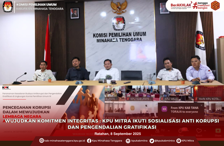 Ratahan - Komisi Pemilihan Umum (KPU) Republik Indonesia menegaskan komitmen antikorupsi dan pengendalian gratifikasi melalui rapat sosialisasi yang digelar Senin, 8 September 2025, secara luring di Ruang Sidang Utama dan daring bersama KPU provinsi serta kabupaten/kota se-Indonesia.