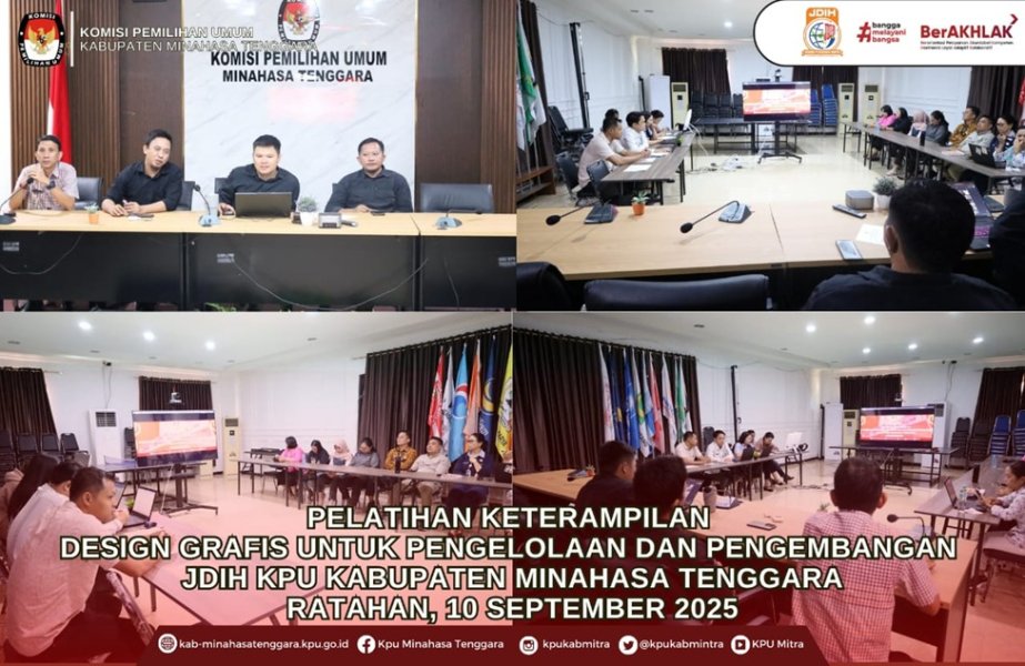 Komisi Pemilihan Umum (KPU) Kabupaten Minahasa Tenggara menggelar Pelatihan Keterampilan Design Grafis Dalam Pengembangan dan Pengelolaan Jaringan Dokumentasi dan Informasi Hukum (JDIH) KPU Kabupaten Minahasa Tenggara. Kegiatan ini berlangsung pada Rabu, 10 September 2025, bertempat di Aula KPU Kabupaten Minahasa Tenggara yang diikuti oleh seluruh jajaran sekretariat.