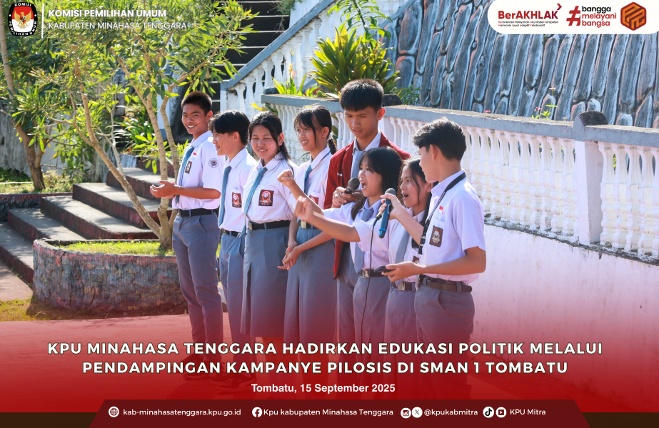 Tombatu - Komisi Pemilihan Umum (KPU) Kabupaten Minahasa Tenggara (Mitra) mendampingi kegiatan kampanye Pemilihan Ketua OSIS (Pilosis) di SMAN 1 Tombatu, Senin (15/9/2025). Kegiatan ini menjadi bagian dari pendidikan pemilih berkelanjutan untuk menanamkan nilai-nilai demokrasi sejak dini.