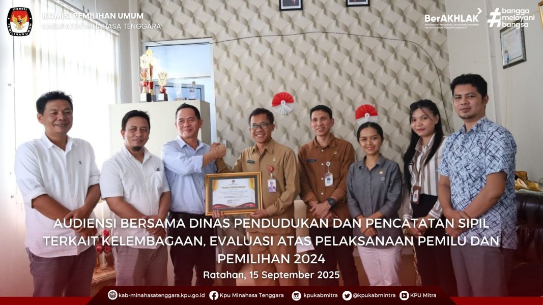 Ratahan, Minahasa Tenggara. Komisi Pemilihan Umum (KPU) Kabupaten Minahasa Tenggara melaksanakan audiensi bersama Dinas Pendudukan dan Pencatatan Sipil (Disdukcapil) Kabupaten Minahasa Tenggara Senin (15/09/2025). Audiensi yang dihadiri oleh Ketua, Anggota, serta staf Sekretariat KPU Mitra ini dilakukan dalam rangka menjalin silaturahmi kelembagaan serta evaluasi atas pelaksanaan Pemilu dan Pilkada 2024.