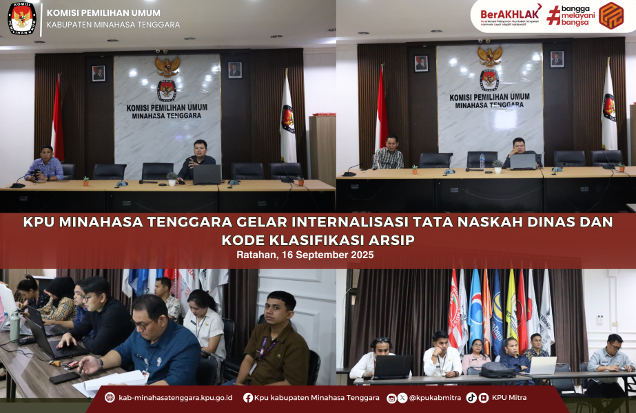 Ratahan – Komisi Pemilihan Umum (KPU) Kabupaten Minahasa Tenggara (Mitra) menggelar internalisasi tata naskah dinas dan kode klasifikasi arsip pada Selasa (16/9) di Aula Kantor KPU Mitra. Kegiatan ini dipandu oleh Kasubag Parmas dan SDM, Budi Tosalenda, dengan penyampaian dari Ketua Divisi Parmas dan SDM, Lucky Mamahit, serta arahan Sekretaris KPU Mitra, Fajri Monoarfa dan diikuti oleh jajaran sekretariat.