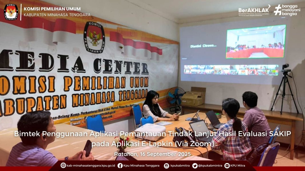 Ratahan - Komisi Pemilihan Umum Republik Indonesia (KPU RI) menggelar kegiatan bimtek Penggunaan Aplikasi Pemantauan Tindak Lanjut Hasil Evaluasi SAKIP pada Aplikasi E-Lapkin secara daring, Selasa (16/9/2025).
