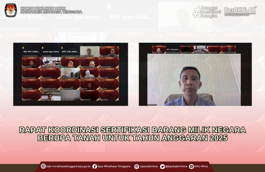 Ratahan-16 September 2025, Komisi Pemilihan Umum Kabupaten Minahasa Tenggara Ikuti Rapat Koordinasi Sertifikasi Barang Milik Negara (BMN) Berupa Tanah Untuk Tahun Anggaran 2025 yang dilaksanakan oleh KPU RI secara daring. Kegiatan ini diikuti oleh Sekrertaris KPU Kabupaten Minahasa Tenggara, Fajri Monoarfa, Kasubbag Keuangan, Umum dan Logistik, Jems J. J. Kumajas dan Operator BMN, Helmi Sualang.