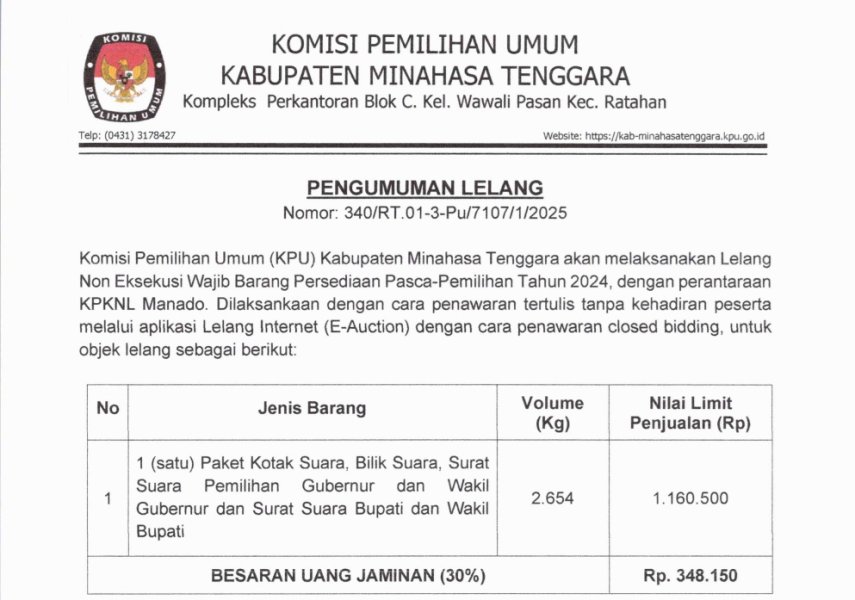 Komisi Pemilihan Umum Kabupaten Minahasa Tenggara akan melaksanakan Penjualan Barang Persediaan Eks Logistik Pemilihan Tahun 2024 secara lelang. Pelaksanaan lelang ini bekerjasama dengan Kantor Pelayanan Kekayaan Negara dan Lelang Manado. Untuk informasi selengkapnya silahkan klik link berikut Pengumuman Lelang