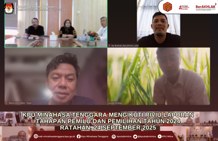 Ratahan - Komisi Pemilihan Umum (KPU) Kabupaten Minahasa Tenggara Mengikuti Kegiatan Riviu Laporan tahapan teknis pemilu dan pemilihan tahun 2024 secara daring via zoom meeting (24/9). Kegiatan ini dilaksanakan oleh KPU Provinsi Sulawesi Utara bersama dengan KPU Kabupaten / Kota Divisi Teknis Penyelenggaraan yang ada di Sulawesi Utara.