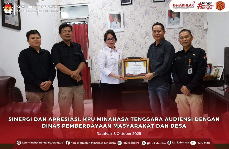 Ratahan – Komisi Pemilihan Umum (KPU) Kabupaten Minahasa Tenggara (Mitra) melaksanakan audiensi dan silaturahmi kelembagaan dengan Dinas Pemberdayaan Masyarakat dan Desa (PMD) Kabupaten Minahasa Tenggara, Rabu (8/10). Kegiatan ini bertujuan mempererat sinergi antarinstansi serta memberikan apresiasi atas kerja sama dan dukungan Dinas PMD dalam penyelenggaraan Pemilu dan Pilkada di wilayah Minahasa Tenggara tahun 2024.