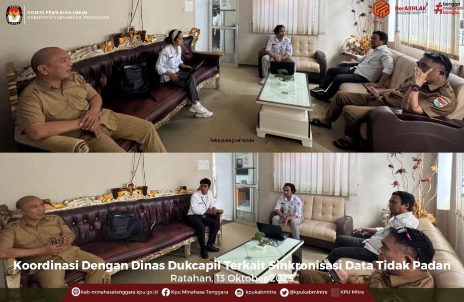 Ratahan, Minahasa Tenggara. Senin, 13 Oktober 2025. Komisi Pemilihan Umum (KPU) Kabupaten Minahasa Tenggara kembali melakukan kunjungan ke Kantor Dinas Kependudukan dan Pencatatan Sipil (Disdukcapil) Kabupaten Minahasa Tenggara . Kunjungan ini sebagai tindak lanjut dari hasil pertemuan pada rabu, 8 Oktober 2025.