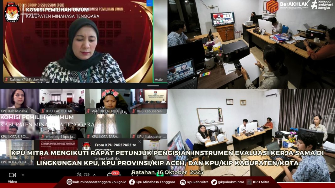 Ratahan - Komisi Pemilihan Umum (KPU) Kabupaten Minahasa Tenggara (Mitra), mengikuti kegiatan Rapat Petunjuk Pengisian Instrumen Evaluasi Kerjasama di Lingkungan KPU, KPU Provinsi/KIP Aceh, dan KPU/KIP Kabupaten/Kota yang diselenggarakan oleh KPU RI secara daring melalui zoom meeting, Kamis (16/10/2025).