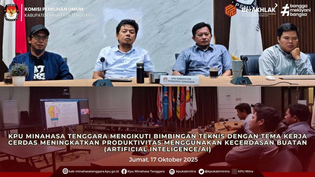 Ratahan– Anggota KPU Minahasa Tenggara Mengikuti Bimbingan Teknis (bimtek) yang diadakan oleh KPU RI secara daring dengan Tema Kerja Cerdas Meningkatkan Produktifitas Menggunakan Kecerdasan Buatan (Artificial Inteligence / AI), Jumat (17/10/2025).