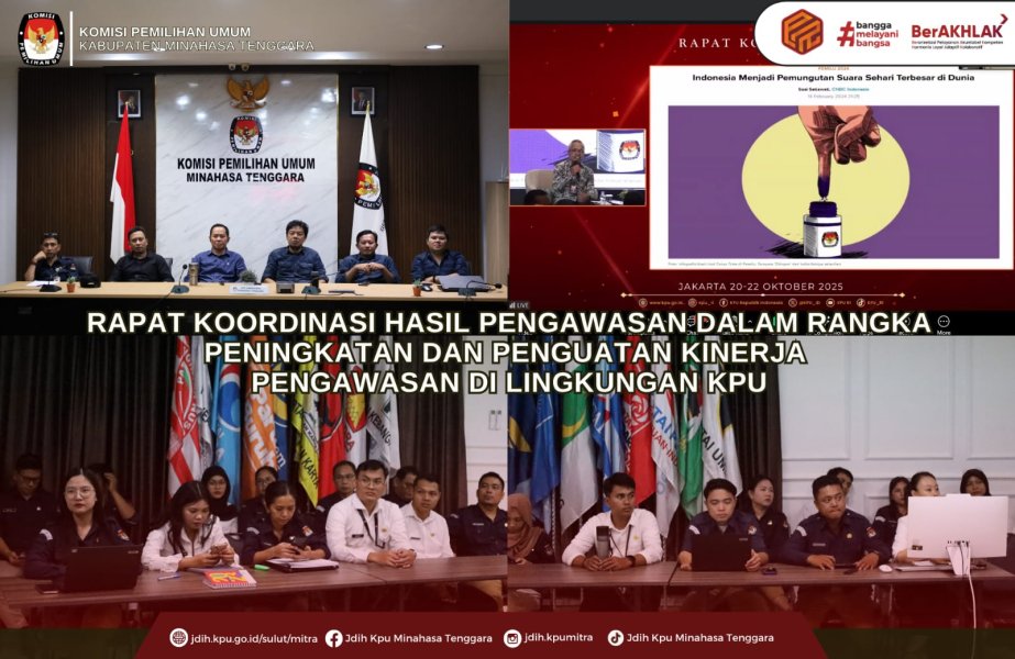 Ratahan- Komisi Pemilihan Umum (KPU) Kabupaten Minahasa Tenggara mengikuti Rapat Koordinasi (Rakor) Pengawasan Dalam Rangka Peningkatan Penguatan Kinerja Pengawasan Di Lingkungan KPU, pada Selasa, 21 Oktober 2025, yang diikuti oleh seluruh jajaran KPU Kabupaten Minahasa Tenggara secara daring.