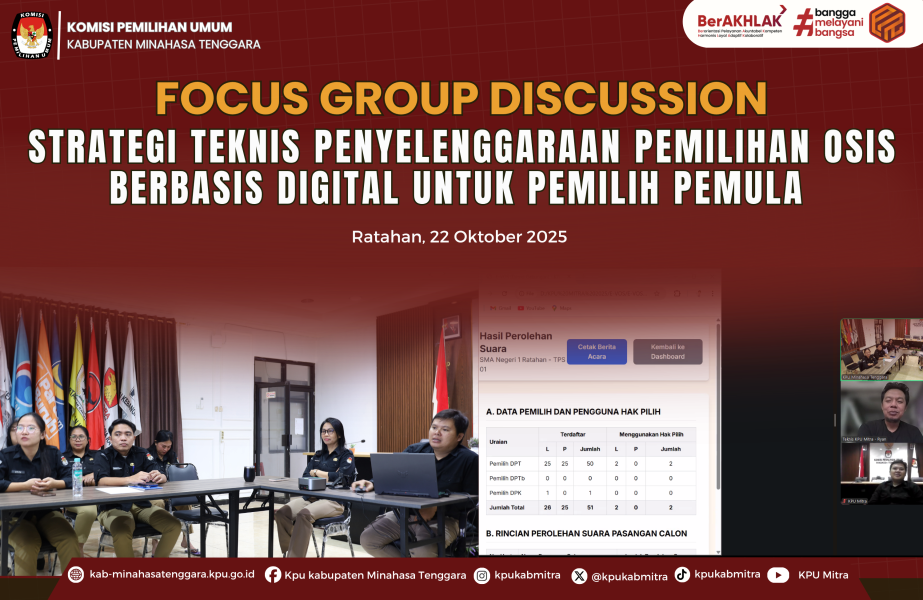 Ratahan - Komisi Pemilihan Umum (KPU) Kabupaten Minahasa Tenggara melalui Divisi Sosialisasi, Pendidikan Pemilih, Partisipasi Masyarakat, dan SDM melaksanakan Focus Group Discussion (FGD) bertema “Strategi Teknis Penyelenggaraan Pemilihan OSIS Berbasis Digital untuk Pemilih Pemula”, Rabu,(22/10/2025).