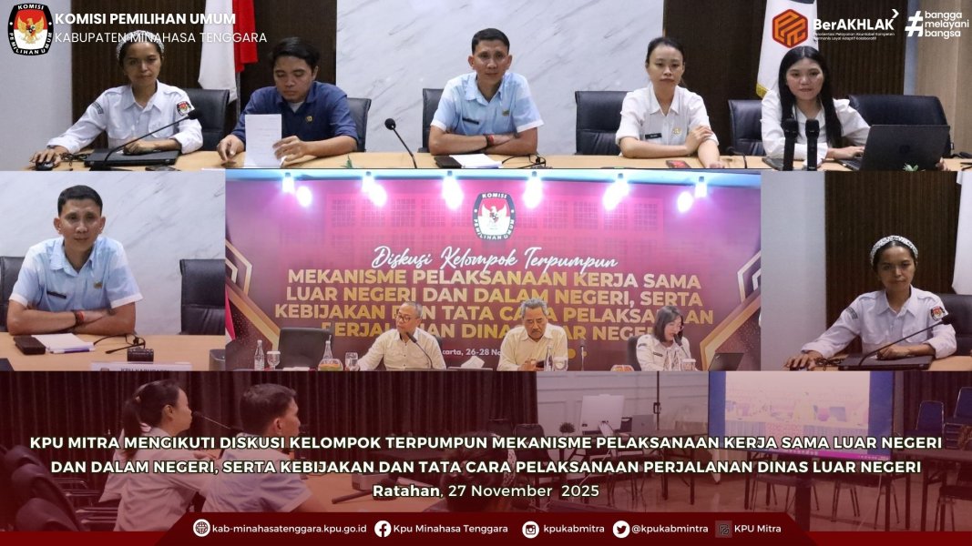 Minahasa Tenggara, 27 November 2025 — Komisi Pemilihan Umum (KPU) Kabupaten Minahasa Tenggara mengikuti Diskusi Kelompok Terpumpun (DKT) yang membahas mekanisme pelaksanaan kerja sama luar negeri dan dalam negeri, serta kebijakan dan tata cara pelaksanaan perjalanan dinas luar negeri. Kegiatan ini dilaksanakan hari ini secara luring dan diikuti secara terpusat dari Aula KPU Minahasa Tenggara.