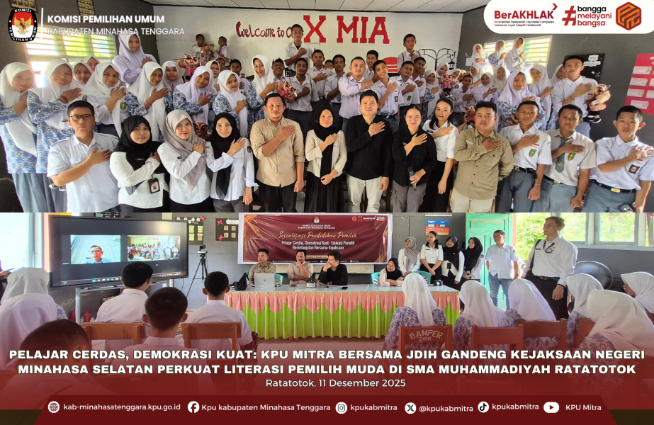 Ratatotok — KPU Kabupaten Minahasa Tenggara melaksanakan sosialisasi pendidikan pemilih bagi pemilih pemula di SMA Muhammadiyah Ratatotok, dengan mengusung tema “Pelajar Cerdas, Demokrasi Kuat: Edukasi Pemilih Berkelanjutan Bersama Kejaksaan”, Kamis (11/12). Kegiatan ini diselenggarakan bekerja sama dengan Jaringan Dokumentasi dan Informasi Hukum (JDIH) KPU Minahasa Tenggara dan menghadirkan narasumber dari Kejaksaan Negeri Minahasa Selatan.