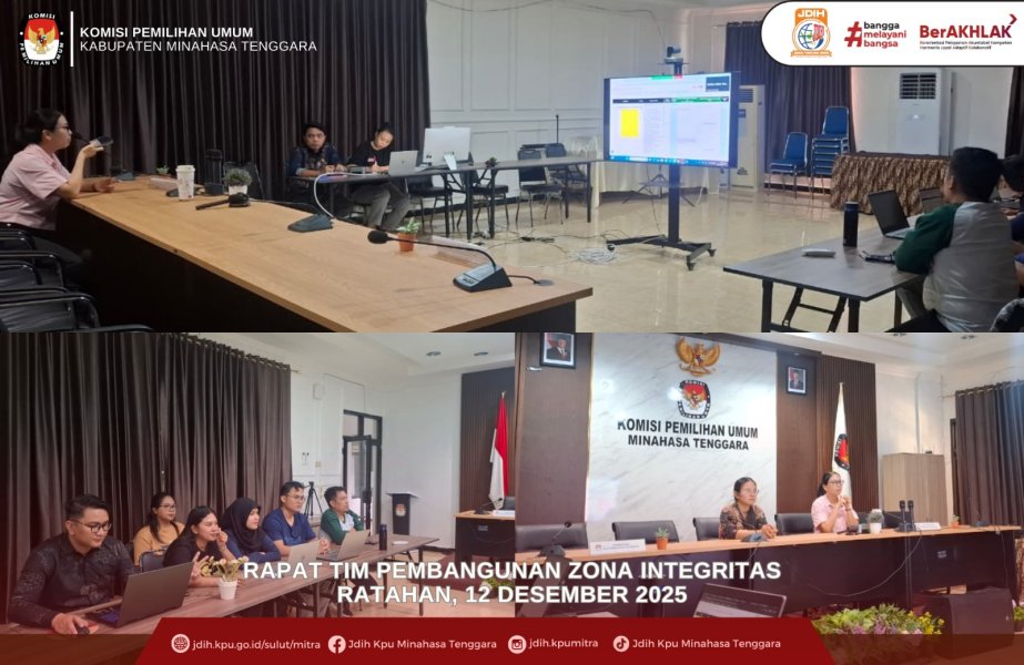 Ratahan — Komisi Pemilihan Umum (KPU) Minahasa Tenggara kembali menggelar rapat Tim Pembangunan Zona Integritas (ZI) dalam rangka Finalisasi Pengisian Lembar Kerja Evaluasi menuju predikat Wilayah Bebas dari Korupsi (WBK) dan Wilayah Birokrasi Bersih dan Melayani (WBBK) pada Jumat (12/12/2025) di aula KPU Minahasa Tenggara dan dihadiri oleh Ketua dan anggota tim pengarah, Ketua, Koordinator dan anggota tim Pembangunan ZI.