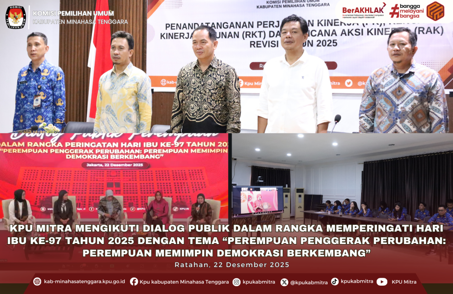 Ratahan - KPU Kabupaten Minahasa Tenggara mengikuti Dialog Publik Peringatan Hari Ibu ke-97 Tahun 2025 yang diselenggarakan secara daring oleh KPU Republik Indonesia, Senin (22/12/2025). Kegiatan ini mengangkat tema “Perempuan Penggerak Perubahan: Perempuan Memimpin, Demokrasi Berkembang”.
