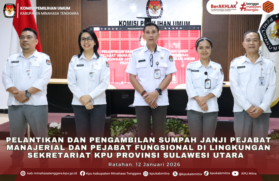Ratahan - Sekretariat Komisi Pemilihan Umum (KPU) Kabupaten Minahasa Tenggara mengikuti Pelantikan dan Pengambilan Sumpah/Janji Pejabat Manajerial dan Pejabat Fungsional yang diselenggarakan oleh Sekretariat KPU Provinsi Sulawesi Utara pada Senin, 12 Januari 2026. Kegiatan ini dilaksanakan secara daring dan diikuti dari ruang rapat KPU Kabupaten Minahasa Tenggara.