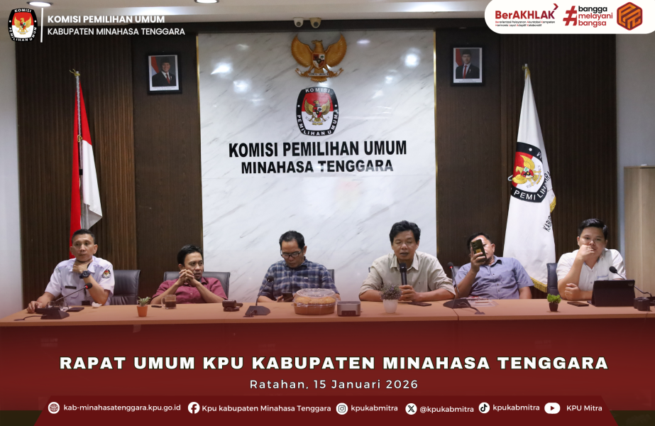 Ratahan — Kamis 16 Januari 2026, Komisi Pemilihan Umum (KPU) Kabupaten Minahasa Tenggara (Mitra) menggelar Rapat Umum Perdana di awal tahun sebagai upaya evaluasi pelaksanaan tugas serta konsolidasi kinerja kelembagaan, yang diikuti oleh seluruh pimpinan KPU, Kasubbag, dan staf pelaksana di lingkungan KPU Kabupaten Minahasa Tenggara.