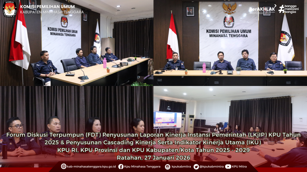 Ratahan - KPU Minahasa Tenggara mengikuti kegiatan Forum Diskusi Terpumpun (FDT) Penyusunan Laporan Kinerja Instansi Pemerintah (LKjIP) KPU Tahun 2025 dan Penyusunan Cascading Kinerja serta Indikator Kinerja Utama (IKU) KPU, KPU Provinsi, dan KPU Kabupaten/Kota Tahun 2025–2029. Kegiatan yang dilaksanakan oleh KPU RI ini diikuti oleh KPU Minahasa Tenggara serta KPU Provinsi dan Kab/Kota se Indonesia secara daring melalui Zoom Meeting.