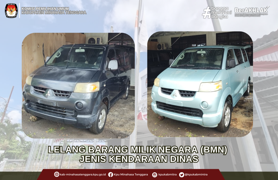 Komisi Pemilihan Umum Kabupaten Minahasa Tenggara akan melaksanakan Penjualan Barang Milik Negara (BMN) Jenis Kendaraan (Mobil) secara lelang. Pelaksanaan lelang ini bekerjasama dengan Kantor Pelayanan Kekayaan Negara dan Lelang Manado. Untuk informasi selengkapnya silahkan klik link dibawah ini: