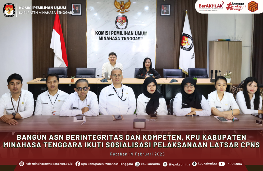 Ratahan - Komisi Pemilihan Umum Kabupaten Minahasa Tenggara mengikuti Sosialisasi Pelaksanaan CPNS KPU Tahun 2026 yang diselenggarakan oleh Balai Diklat Keagamaan Manado pada Kamis (19/2/2026). Kegiatan dilaksanakan secara daring melalui Zoom Meeting dan diikuti dari Ruang Rapat KPU Kabupaten Minahasa Tenggara bersama satuan kerja lainnya di wilayah Provinsi Sulawesi Utara dan Provinsi Gorontalo.