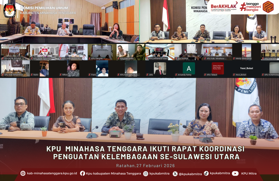 Ratahan — Komisi Pemilihan Umum Kabupaten Minahasa Tenggara mengikuti Rapat Koordinasi (Rakor) Penguatan Kelembagaan KPU se-Sulawesi Utara yang digelar secara daring oleh Komisi Pemilihan Umum Provinsi Sulawesi Utara, Jumat (27/2/2026).
