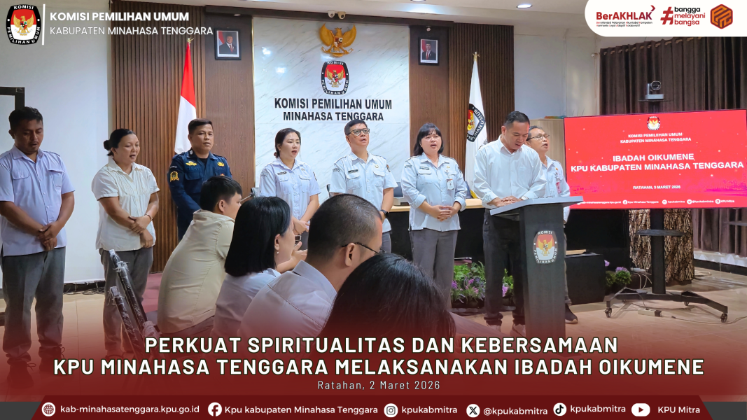 Ratahan — Komisi Pemilihan Umum Kabupaten Minahasa Tenggara melaksanakan Ibadah Oikumene sebagai bagian dari pembinaan rohani dan penguatan nilai-nilai spiritual seluruh jajaran kelembagaan. Ibadah tersebut dipimpin langsung oleh Ketua KPU Kabupaten Minahasa Tenggara, Otnie N Tamod, dan diikuti anggota komisioner, sekretariat, serta seluruh pegawai KPU Kabupaten Minahasa Tenggara yang beragama kristen.