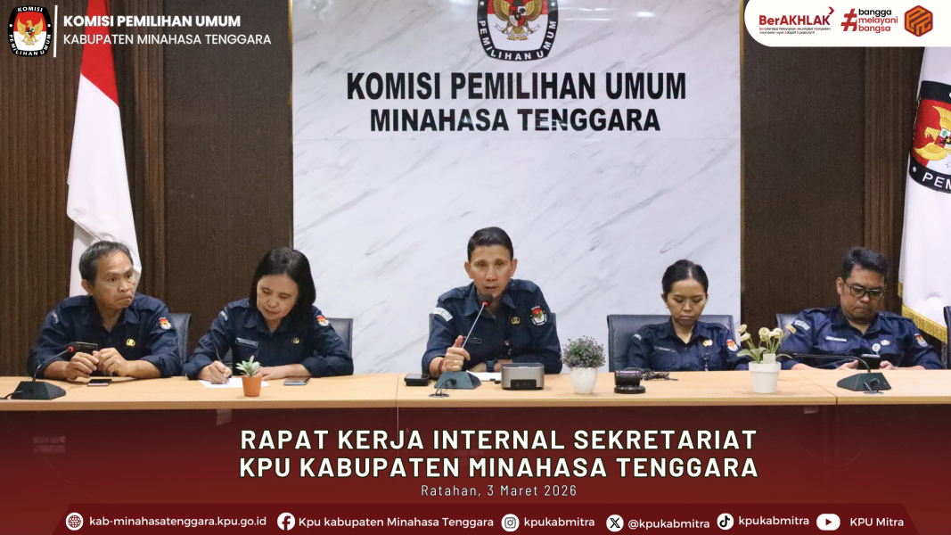 Ratahan – Sekretariat KPU Kabupaten Minahasa Tenggara melaksanakan Rapat Kerja Internal pada Selasa, 3 Maret 2026, di Kantor KPU Minahasa Tenggara. Kegiatan yang dimulai pukul 09.30 WITA tersebut dibuka oleh Kasubbag Keuangan, Umum, dan Logistik,Jems.J.J Kumajas dengan arahan awal dari Sekretaris, Fajri Monoarfa mengenai penguatan peran sekretariat dalam mendukung pelaksanaan tugas kelembagaan.