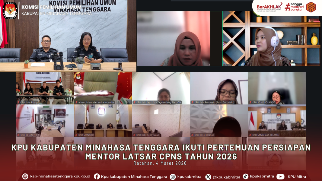 Ratahan - Komisi Pemilihan Umum (KPU) Kabupaten Minahasa Tenggara mengikuti Pertemuan Persiapan Mentor Latsar CPNS KPU Tahun 2026 yang dilaksanakan secara daring melalui Zoom Meeting pada Selasa, 4 Maret 2026. Kegiatan ini digelar oleh Balai Diklat Keagamaan Manado sebagai bagian dari tahapan persiapan pelaksanaan Latsar CPNS di lingkungan KPU.
