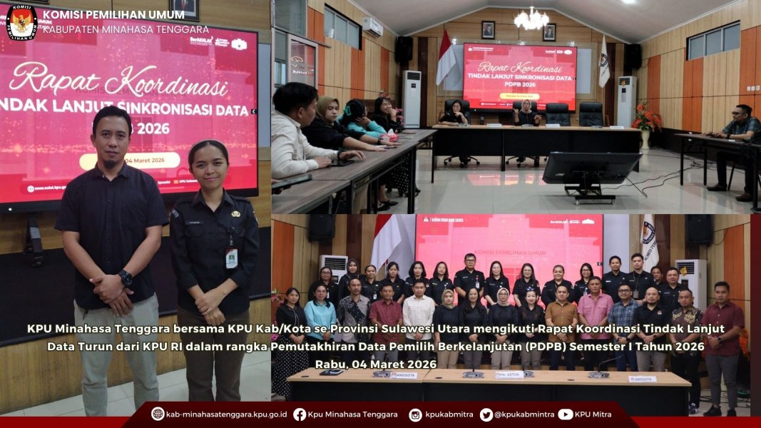 Rabu, 4 Maret 2026, KPU Minahasa Tenggara bersama KPU Kab/Kota se Provinsi Sulawesi Utara mengikuti Rapat Koordinasi Tindak Lanjut Data Turun dari KPU RI dalam rangka Pemutakhiran Data Pemilih Berkelanjutan (PDPB) Semester I Tahun 2026 yang diselenggarakan oleh KPU Provinsi Sulawesi Utara.