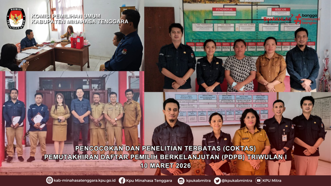Minahasa Tenggara, Selasa 10 Maret 2026 — Komisi Pemilihan Umum (KPU) Kabupaten Minahasa Tenggara melaksanakan kegiatan Pencocokan dan Penelitian Terbatas (Coktas) terhadap Daftar Pemilih Berkelanjutan (PDPB) Triwulan I Tahun 2026 di empat kecamatan, yaitu Kecamatan Pusomaen, Ratahan Timur, Silian Raya, dan Touluaan.