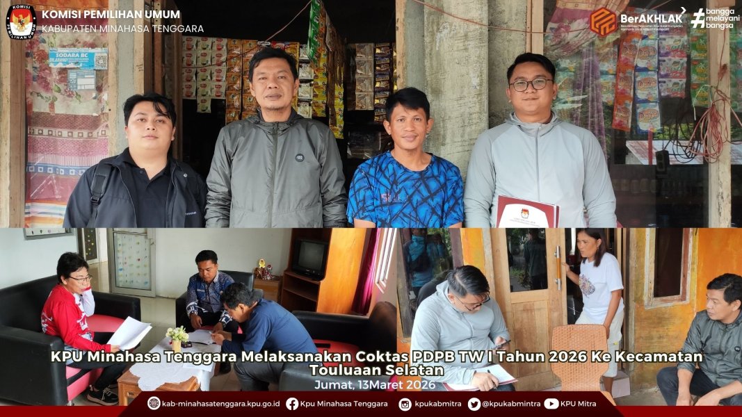 Ratahan, 13 Maret 2026.- Komisi Pemilihan Umum (KPU) Kabupaten Minahasa Tenggara melaksanakan kegiatan Pencocokan dan Penelitian Terbatas (Coktas) Triwulan I Tahun 2026 di wilayah Kecamatan Touluaan Selatan. Kegiatan ini merupakan bagian dari upaya KPU dalam memastikan validitas dan akurasi data pemilih secara berkelanjutan.