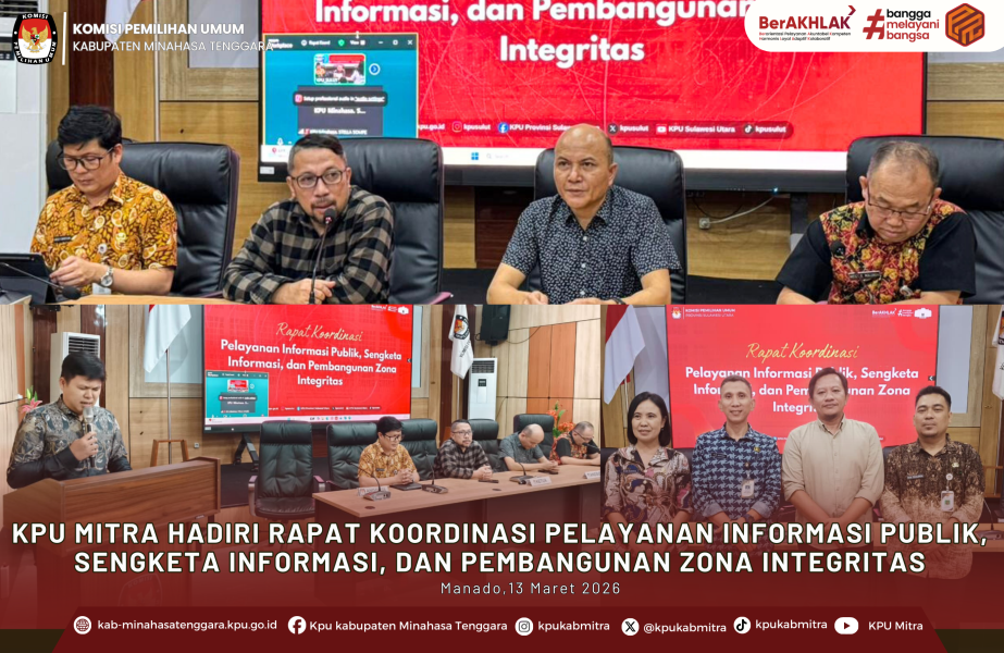 Manado – Komisi Pemilihan Umum Kabupaten Minahasa Tenggara menghadiri Rapat Koordinasi Pelayanan Informasi Publik, Sengketa Informasi, dan Pembangunan Zona Integritas yang diselenggarakan oleh Komisi Pemilihan Umum Provinsi Sulawesi Utara. Kegiatan dilaksanakan secara luring di Kantor KPU Provinsi Sulawesi Utara pada Jumat (13/3/2026) dan diikuti oleh jajaran KPU Kabupaten/Kota se-Sulawesi Utara.