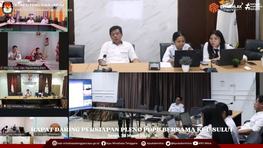 Minahasa Tenggara, Senin 30 Maret 2026.- Komisi Pemilihan Umum (KPU) Kabupaten Minahasa Tenggara mengikuti Rapat Daring Persiapan Pleno Pemutakhiran Data Pemilih Berkelanjutan (PDPB) bersama KPU Provinsi Sulawesi Utara. Kegiatan ini dilaksanakan secara virtual sebagai bagian dari upaya koordinasi dan konsolidasi menjelang pelaksanaan pleno PDPB di tingkat kabupaten/kota.