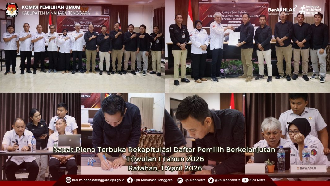 Ratahan — Komisi Pemilihan Umum (KPU) Kabupaten Minahasa Tenggara melaksanakan Rapat Pleno Terbuka Rekapitulasi Daftar Pemilih Berkelanjutan Triwulan I Tahun 2026. Kegiatan ini merupakan bagian dari upaya berkelanjutan KPU dalam menjaga akurasi dan mutakhirnya data pemilih.