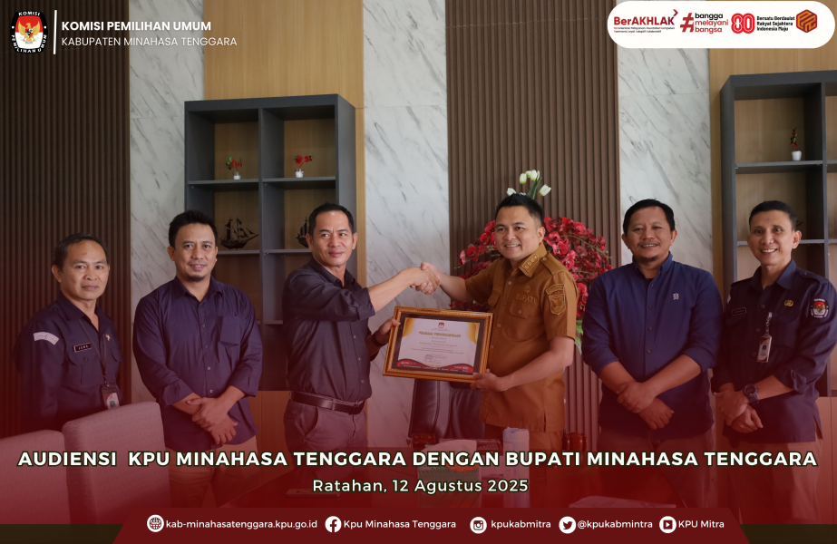 #TemanPemilih, Komisi Pemilihan Umum (KPU) Kabupaten Minahasa Tenggara melakukan audiensi dan penyerahan piagam penghargaan kepada Pemerintah Kabupaten Minahasa Tenggara sebagai bentuk apresiasi atas dukungan dan partisipasi aktif dalam menyukseskan penyelenggaraan Pemilihan Kepala Daerah (Pilkada) Tahun 2024. Penghargaan tersebut diterima langsung oleh Bupati Minahasa Tenggara, Ronald Kandoli.