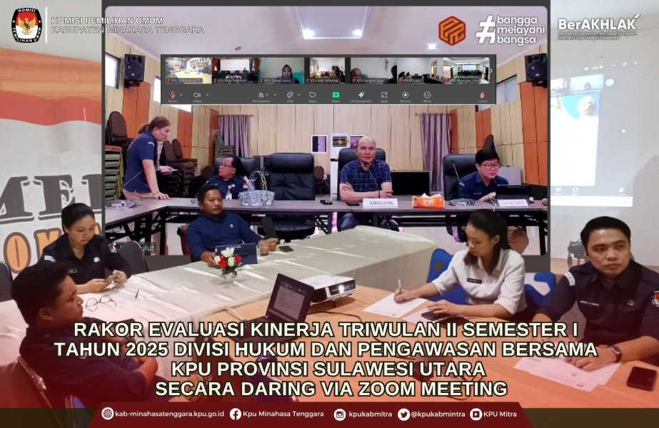 Ratahan - Komisi Pemilihan Umum (KPU) Kabupaten Minahasa Tenggara mengikuti Rapat Koordinasi (Rakor) terkait Evaluasi Kinerja Triwulan II - Semester I Tahun 2025 Divisi Hukum dan Pengawasan bersama KPU Provinsi Sulawesi Utara pada Selasa, 1 Juli 2025 yang dilaksanakan secara daring via Zoom Meeting.
