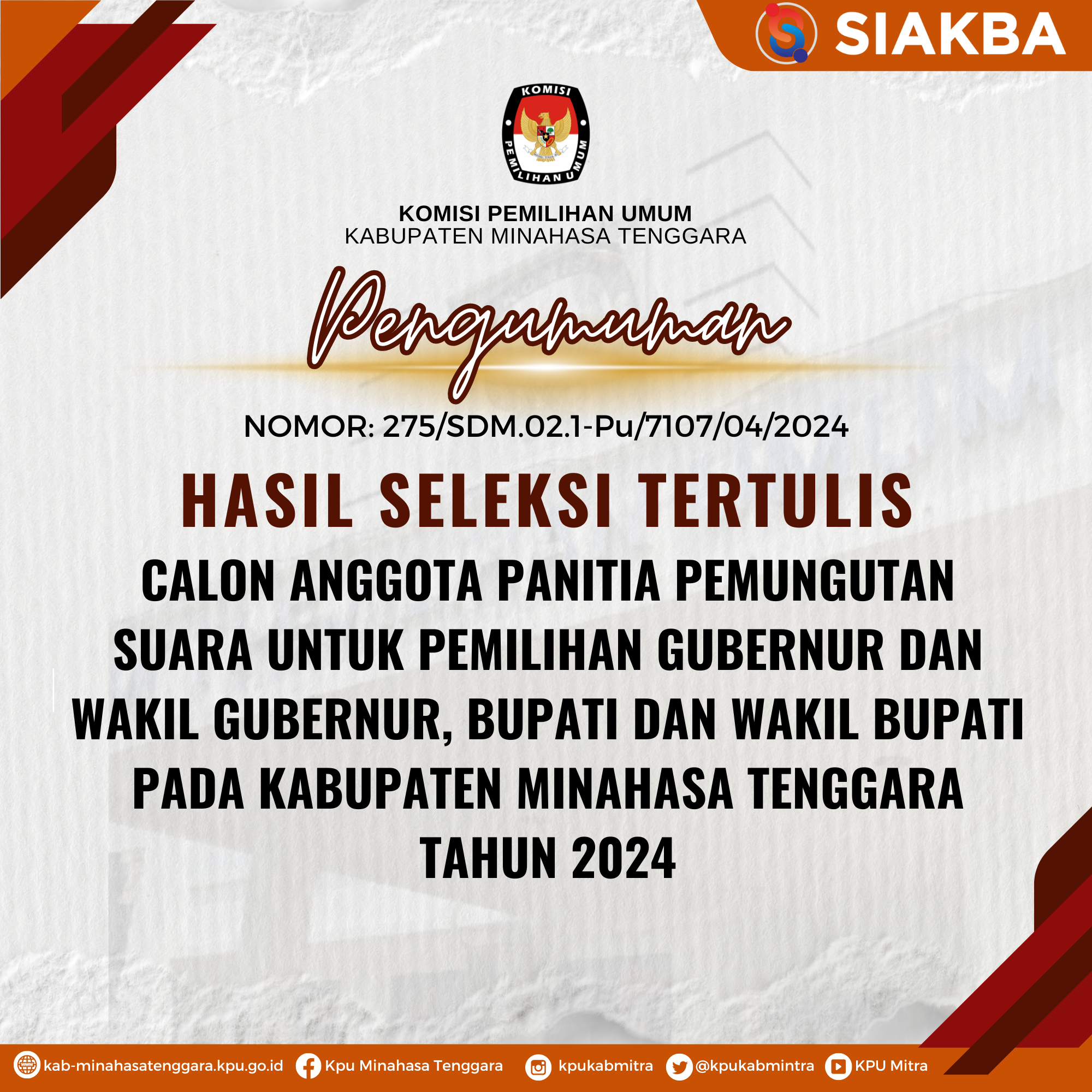 Sehubungan dengan Komisi Pemilihan Umum Kabupaten Minahasa Tenggara telah melaksanakan tahapan Seleksi Tertulis Calon Anggota Panitia Pemungutan Suara pada untuk Pemilihan Gubernur dan Wakil Gubernur, Bupati dan Wakil Bupati Tahun 2024, disampaikan pengumuman hasil seleksi tersebut.