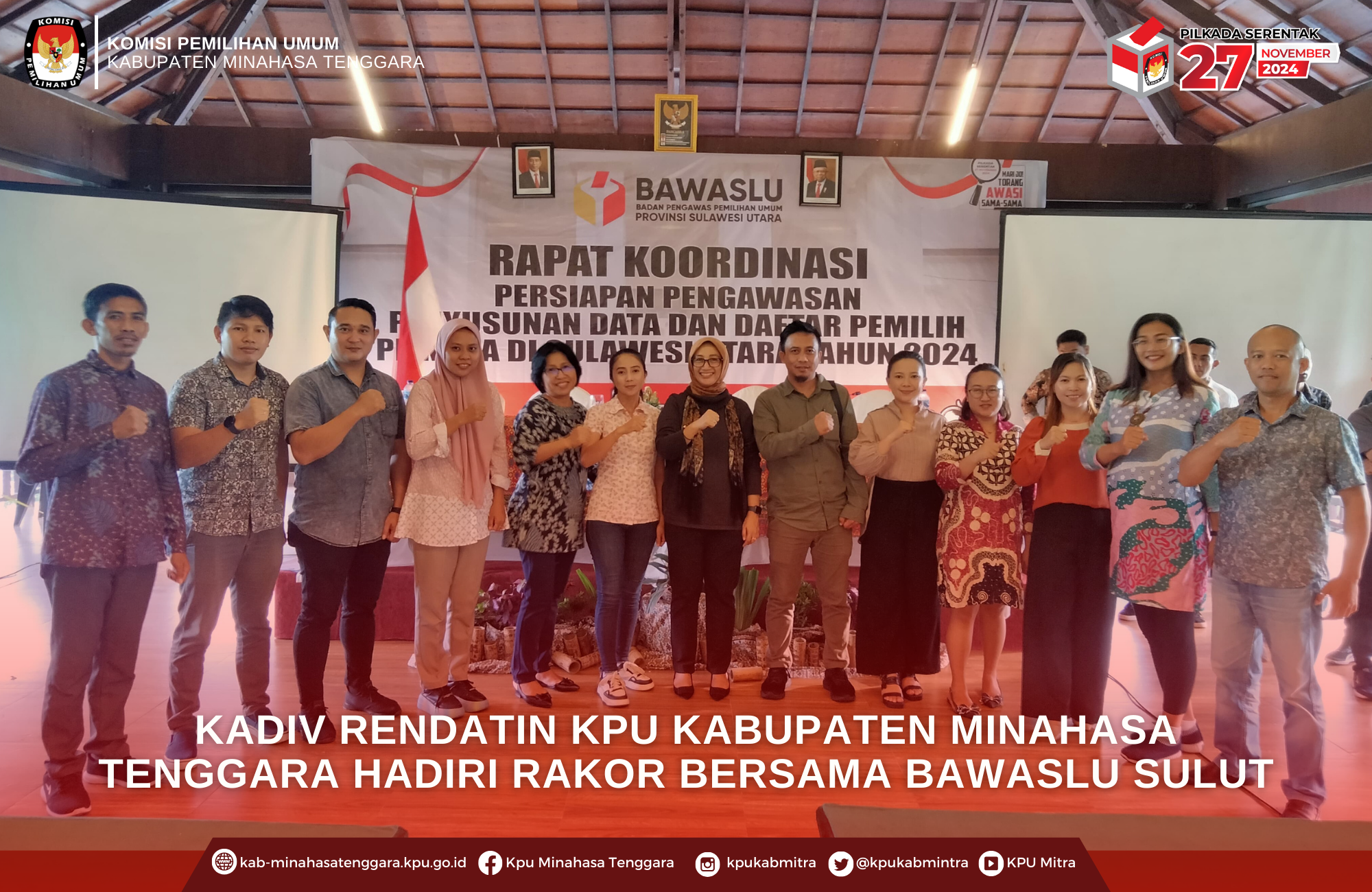 Manado - Ketua Divisi (Kadiv) Perencanaan Data dan Informasi (Rendatin) Komisi Pemilihan Umum (KPU) Kabupaten Minahasa Tenggara (Mitra), Aulia Syukur, hadir dalam Rapat Koordinasi (Rakor) Persiapan Pengawasan Penyusunan Data dan Daftar Pemilih Pemilihan Kepala Daerah (Pilkada) Sulawesi Utara (Sulut) Tahun 2024. Kegiatan yang dimotori Badan Pengawas Pemilu (Bawaslu) Provinsi Sulut ini digelar di NDC Hotel Manado, Kamis (13/6/2024) sampai Sabtu (15/6/2024).