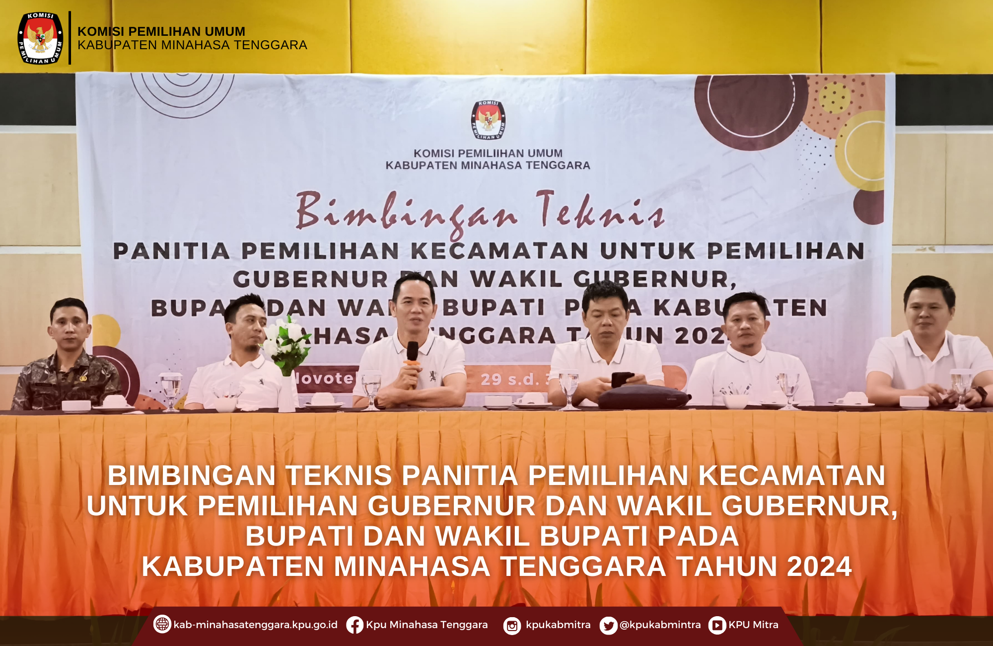 menggelar kegiatan Bimbingan Teknis (Bimtek) bagi 60 anggota Panitia Pemilihan Kecamatan (PPK) dalam rangka persiapan Pemilihan Kepala Daerah (Pilkada) tahun 2024. Acara Bimtek ini dilaksanakan selama tiga hari, bertempat di Novotel Manado, dan melibatkan berbagai pemangku kepentingan seperti Badan Pengawas Pemilu (Bawaslu), Kepolisian, TNI, Kejaksaan, serta Pemerintah Daerah.