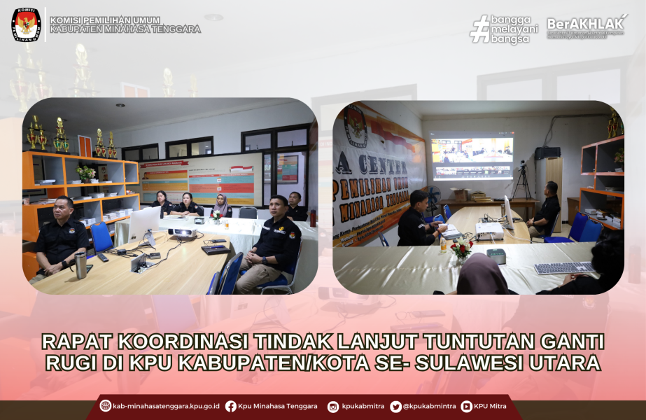 Ratahan - Komisi Pemilihan Umum Kabupaten Minahasa Tenggara mengikuti kegiatan Rapat Koordinasi Tindak Lanjut Tuntutan Ganti Rugi di KPU Kabupaten/Kota Se- Sulawesi Utara pada Rabu, 23 Juli 2025 via Zoom Meeting di kantor KPU Mitra. Kegiatan ini diikuti oleh Ketua, Sekretaris, Kepala Sub Bagian Keungan, Umum dan Logistik serta Tim Pengelola Keuangan KPU Kabupaten Minahasa Tenggara
