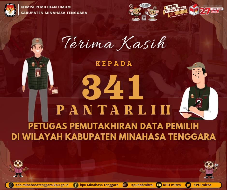 Ratahan - Komisi Pemilihan Umum (KPU) Kabupaten Minahasa Tenggara menyampaikan apresiasi yang tinggi kepada 341 Petugas Pemutakhiran Data Pemilih (Pantarlih) yang telah menyelesaikan tugas mereka dalam tahapan pemutakhiran data pemilih untuk Pemilihan Kepala Daerah (Pilkada) tahun 2024. Masa kerja para petugas ini resmi berakhir pada tanggal 24 Juli 2024.