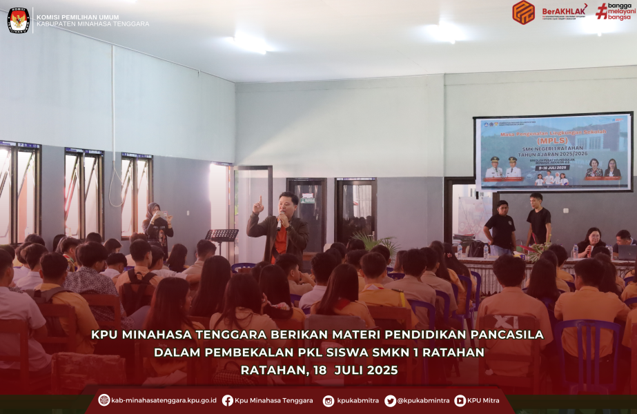 Ratahan - Sebagai bagian dari upaya membangun karakter pelajar yang berjiwa kebangsaan, Komisi Pemilihan Umum (KPU) Kabupaten Minahasa Tenggara turut berperan dalam kegiatan Pembekalan Praktek Kerja Lapangan (PKL) di SMKN 1 Ratahan. Dalam kesempatan ini, Komisioner Divisi Sosialisasi, Pendidikan Pemilih, Partisipasi Masyarakat, dan SDM, Bapak Lucky Mamahit, hadir sebagai narasumber dengan membawakan materi Pendidikan Pancasila.