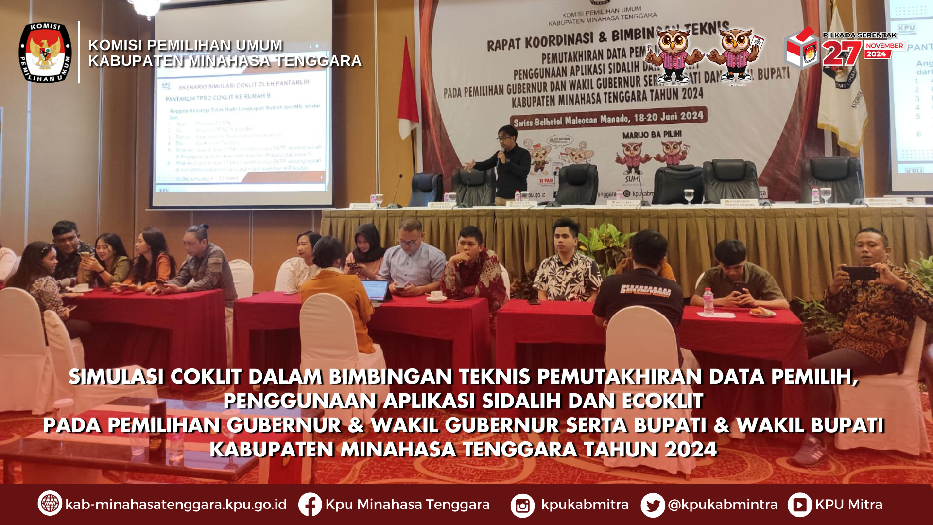 Manado - Komisi Pemilihan Umum (KPU) Kabupaten Minahasa Tenggara (Mitra) melakukan simulasi Pencocokan dan Penelitian (Coklit) dalam Kegiatan Rapat Koordinasi (Rakor) dan Bimbingan Teknis (Bimtek) Pemutakhiran Data Pemilih, Penggunaan Aplikasi Sistem Informasi Data Pemilih (Sidalih) dan E-Coklit, di Swiss-Belhotel Maleosan, Manado, Rabu (19/6/2024).