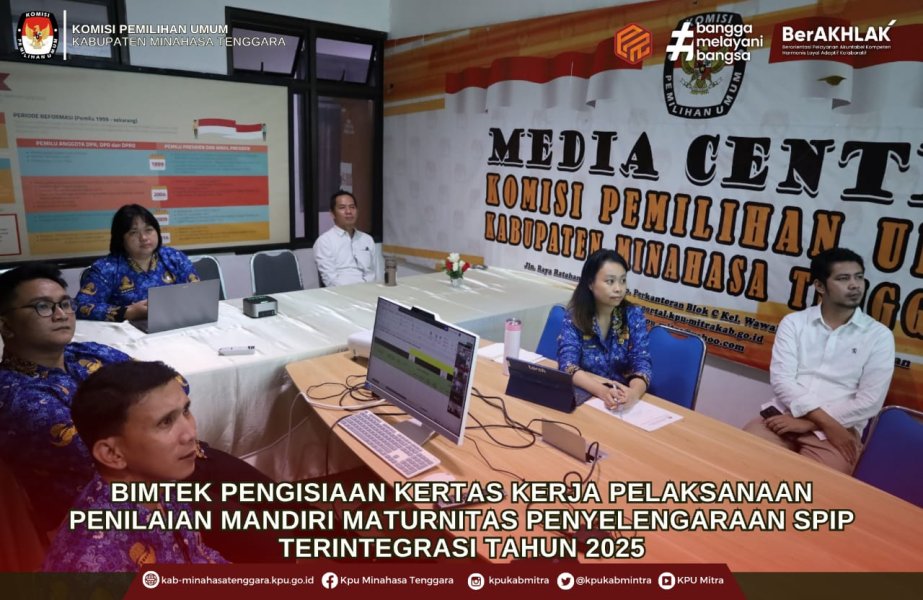 Ratahan - Komisi Pemilihan Umum (KPU) Minahasa Tenggara (Mitra) mengikuti Bimbingan Teknis (Bimtek) bersama KPU RI terkait Pengisian Kertas Kerja Pelaksanaan Penilaian Mandiri Maturitas Penyelenggaraan SPIP Terintegrasi Tahun 2025 pada Kamis, 17 Juli 2025 via Zoom Meeting di kantor KPU Mitra.