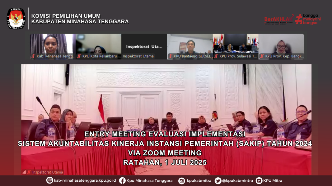 Ratahan - Komisi Pemilihan Umum (KPU) Kabupaten Minahasa Tenggara mengikuti Entry Meeting Evaluasi Sistem Akuntabilitas Kinerja Instansi Pemerintah (SAKIP) Tahun 2024 yang diselenggarakan oleh Inspektorat KPU Republik Indonesia, Selasa (1/7/2024) pukul 13.00 WIB secara daring melalui Zoom Meeting. Kegiatan ini merupakan bagian dari rangkaian evaluasi internal yang dilakukan oleh tim Inspektorat KPU RI sebagai upaya penguatan akuntabilitas kinerja di lingkungan KPU seluruh Indonesia.