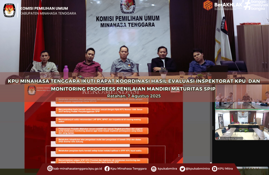 Ratahan - Komisi Pemilihan Umum (KPU) Kabupaten Minahasa Tenggara mengikuti rapat Koordinasi Hasil Evaluasi Inspektorat KPU terhadap Pelaporan Kartu Kendali SPIP Triwulan I 2025 dan Monitoring Progres Penilaian Mandiri Maturitas SPIP yang dilaksanakan oleh KPU Provinsi Sulawesi Utara secara daring melalui Zoom Meeting, 7 Agustus 2025.