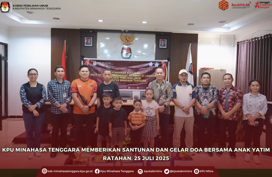 Ratahan, 25 Juli 2025 — Komisi Pemilihan Umum (KPU) Kabupaten Minahasa Tenggara menggelar kegiatan sosial bertajuk “KPU Peduli Anak Yatim: Muharam Penuh Berkah”, yang dilaksanakan di Kantor KPU Minahasa Tenggara.