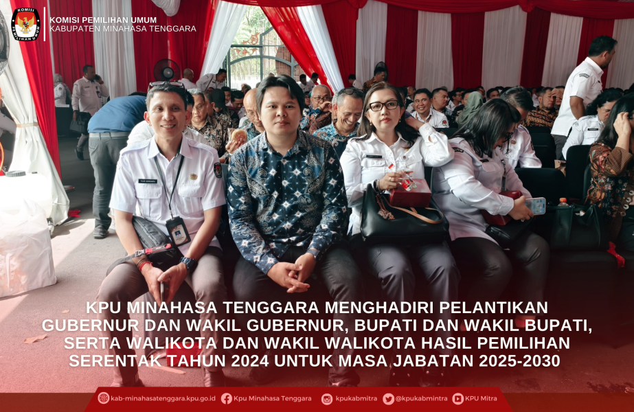 kab-minahasatenggara.kpu.go.id, Ratahan - Komisi Pemilihan Umum Kabupaten Minahasa Tenggara (KPU Mitra) diwakili oleh Ketua Divisi Sosialisasi, Pendidikan Pemilih, Partisipasi Masyarakat dan Sumber Daya Manusia, Lucky Mamahit dan Sekretaris KPU Mitra, Fajri Manoarfa menghadiri Pelantikan Gubernur dan Wakil Gubernur, Bupati dan Wakil Bupati, serta Walikota dan Wakil Walikota hasil Pemilihan Serentak Tahun 2024 untuk Masa Jabatan Tahun 2025-2030, di Istana Merdeka, Jakarta, Kamis (20/2/2025).