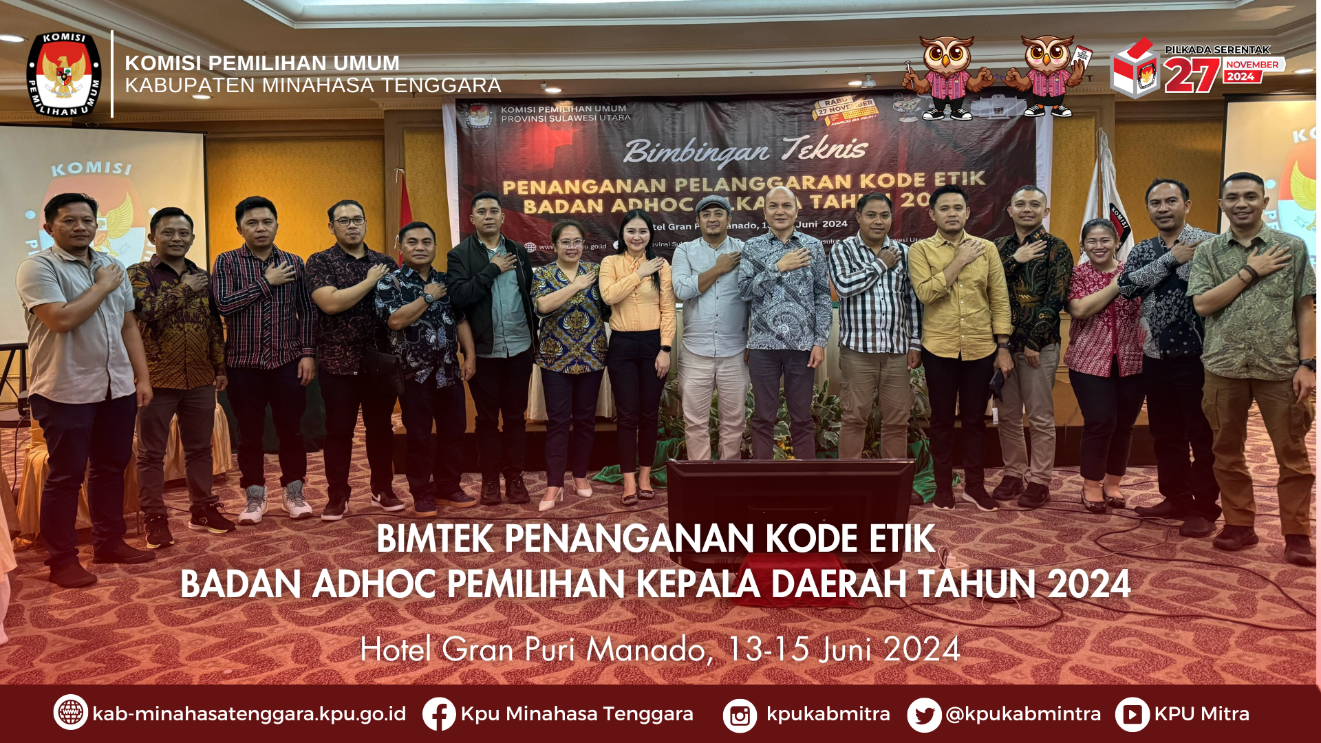 Manado - Komisi Pemilihan Umum Kabupaten Minahasa Tenggara mengikuti Bimbingan Teknis Penanganan Kode Etik Badan Adhoc Pemilihan Kepala Daerah Tahun 2024 Bersama seluruh KPU Kab/Kota yg dilaksanakkan oleh KPU Provinsi Sulawesi Utara selama 3 Hari Mulai dari Tanggal 13 s/d 15 Juni 2024 bertempat di Hotel Grand Puri Manado. Dalam Bimbingan Teknis Penanganan Kode Etik Badan Adhoc Pemilihan Kepala Daerah Tahun 2024 juga dilakukan simulasi sidang penanganan pelanggaran kode etik anggota badan Adhoc yg melakukan pelanggaran etik.