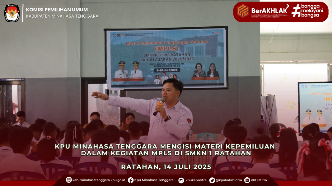 Ratahan - Komisi Pemilihan Umum (KPU) Kabupaten Minahasa Tenggara terus mengintensifkan upaya pendidikan pemilih berkelanjutan, salah satunya melalui kegiatan Masa Pengenalan Lingkungan Sekolah (MPLS) di SMKN 1 Ratahan. Kegiatan edukasi kepemiluan yang menyasar siswa baru sebagai calon pemilih pemula ini merupakan hasil kolaborasi antara pihak sekolah dan KPU Kabupaten Minahasa Tenggara, dengan tujuan membekali generasi muda dengan pemahaman dasar mengenai demokrasi serta pentingnya menggunakan hak pilih secara bijak.